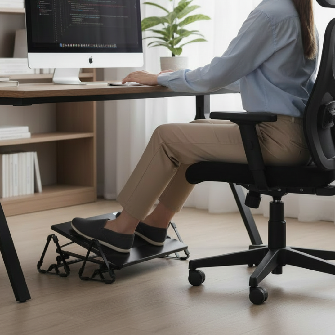 El apoya pies proporciona al usuario el descanso en los miembros inferiores elevando los muslos a un ángulo de 95° aprox. en relación al tronco. Posiciona las rodillas en la misma altura o ligeramente por encima de la articulación de la cadera, evitando la compresión de la parte posterior de los muslos dejando la libre circulación de la sangre.
