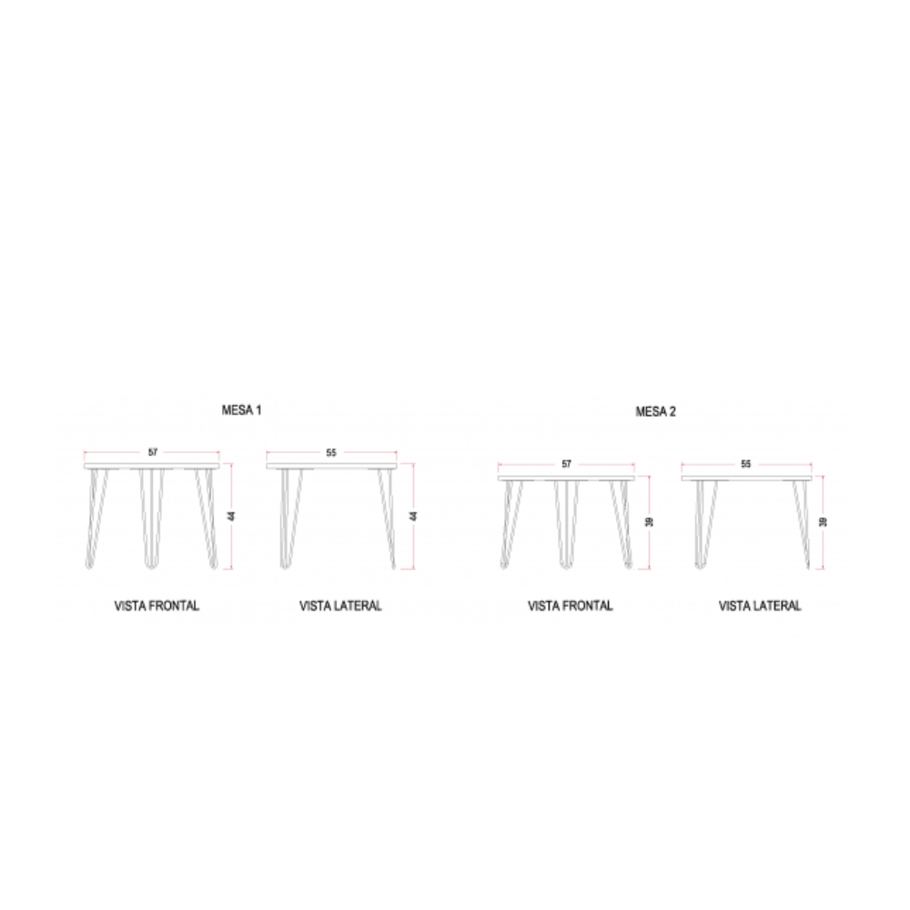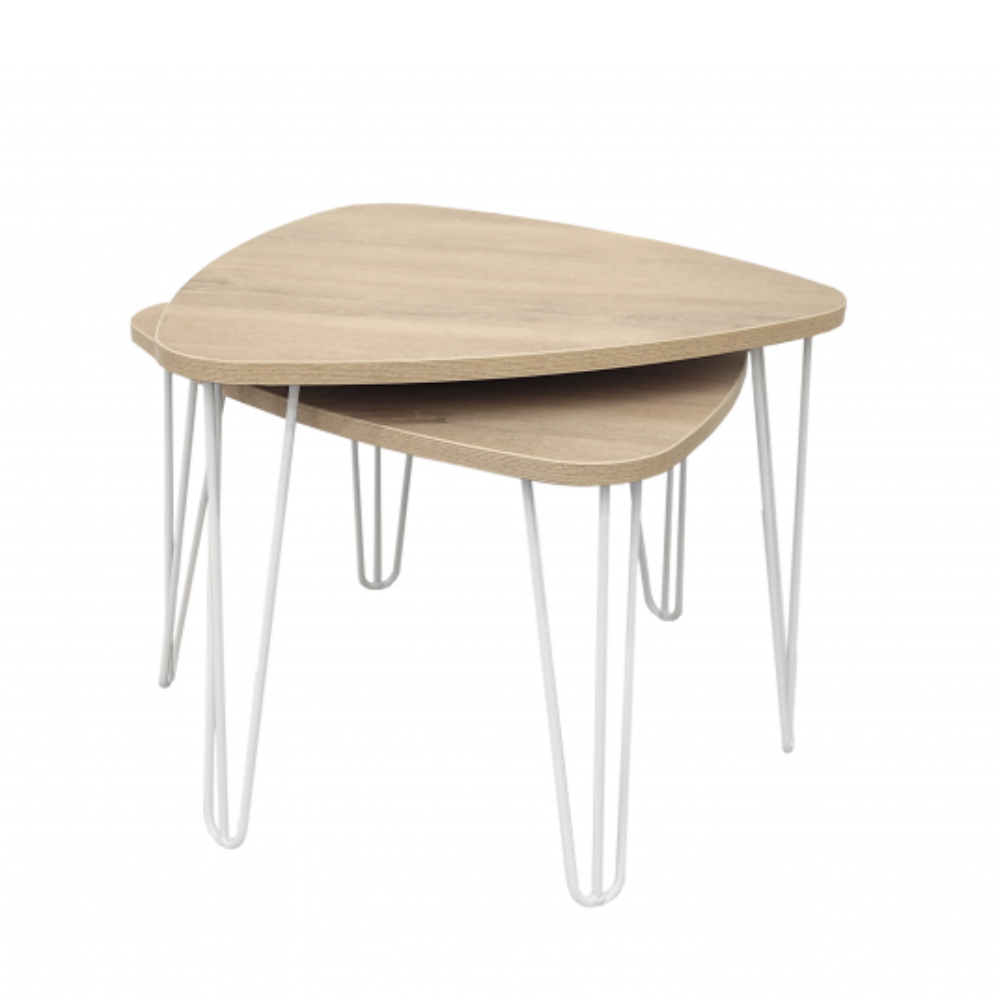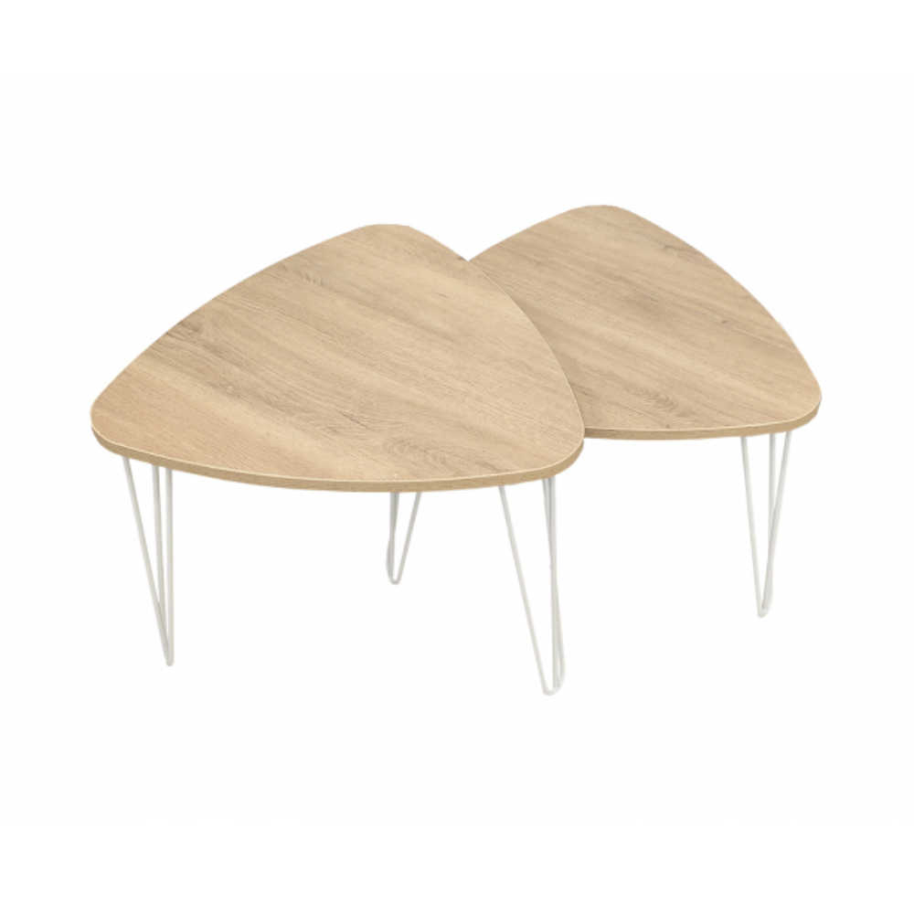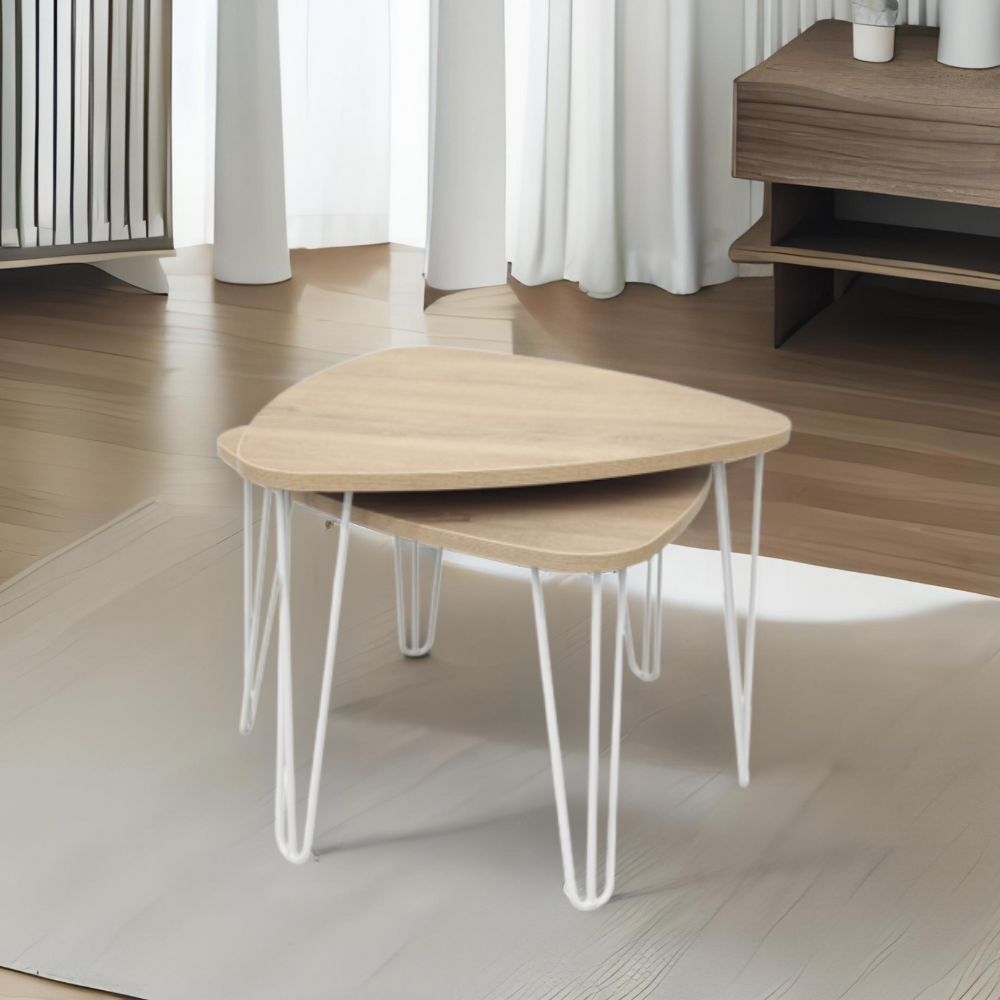 Set de 2 mesas de diferentes alturas. Cubierta de melamina 18mm de forma oval de 58x45 cm, color Jerez. 3 patas de acero trefilado, pintadas blancas. Altura 44 y 39 cm.
