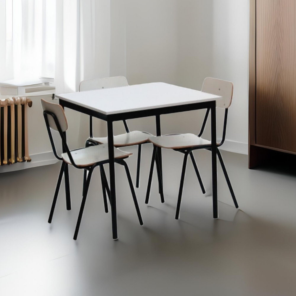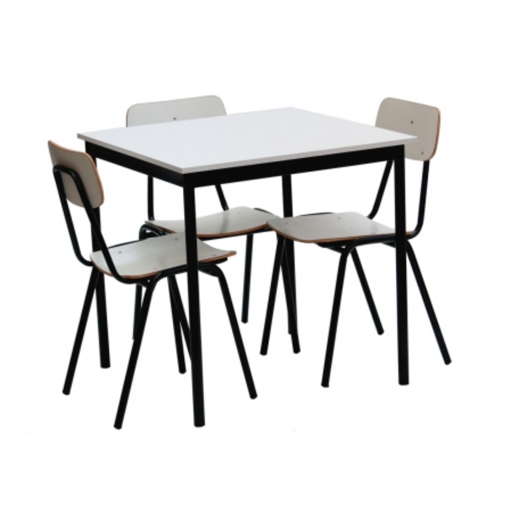 Cubierta en melamina 15mm color Blanco de 760x760mm. Estructura en perfil de acero, patas en tubo Ø 1 1/4", esmaltada al horno color negro. Altura 740mm. Uso hasta 4 personas. Peso bruto: 11,5 Kg. No incluye las sillas.