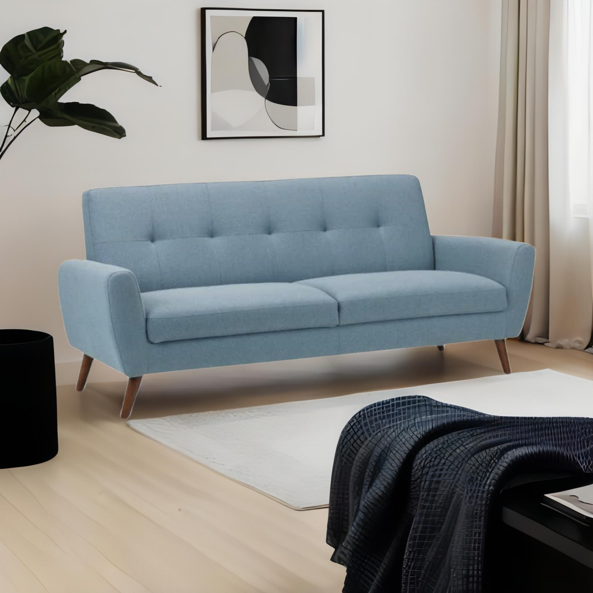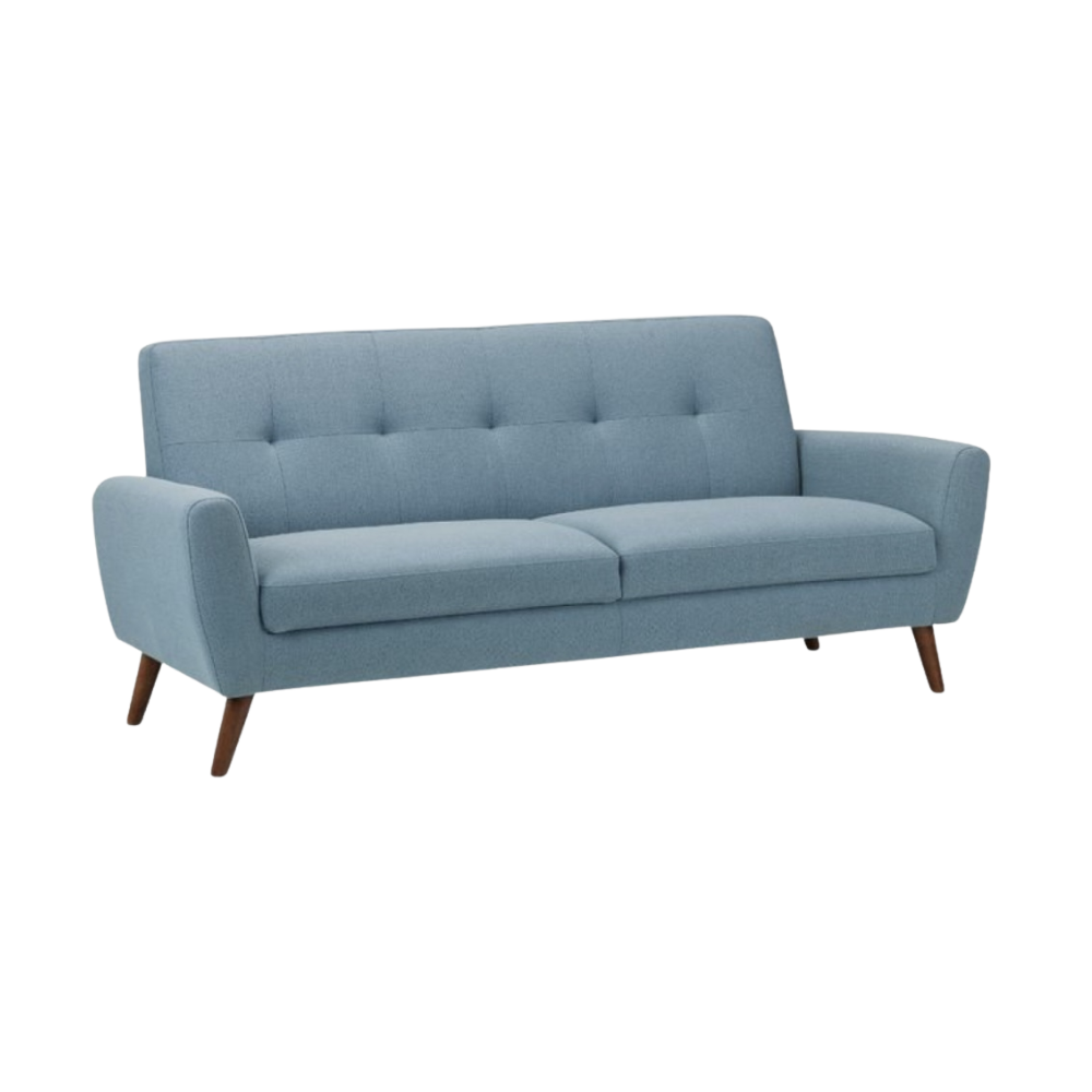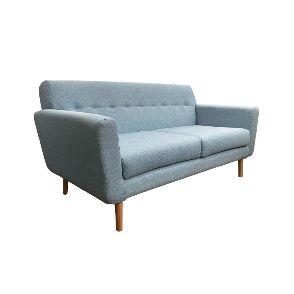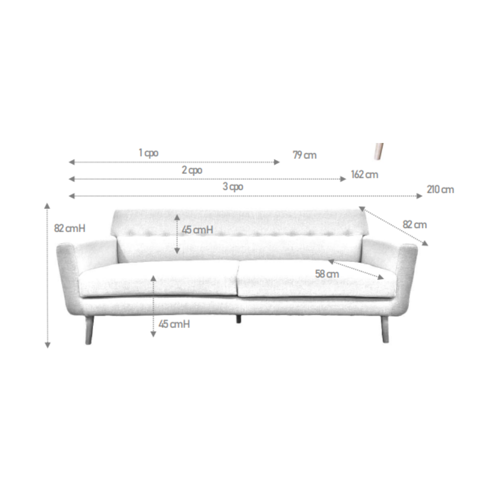 Tiene un diseño retro. Su estructura interna está fabricada en madera pino y terciado de 15 mm. Todo revestido con espuma de alta densidad. Cojines desmontables. Base patas de madera torneada barniz natural. Tapiz: Lana. Color a elección.